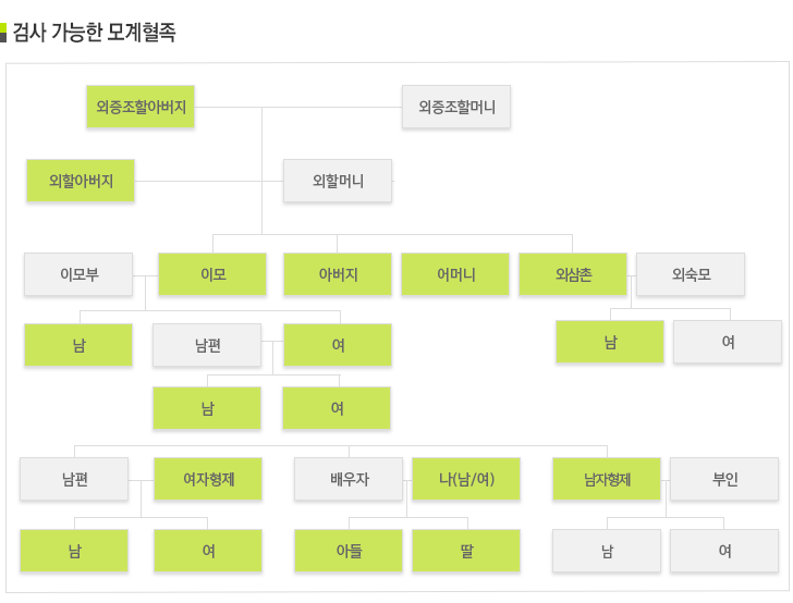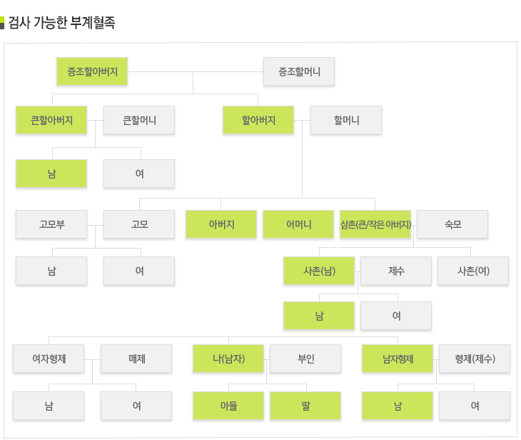 혈족확인검사는 남자조상을 가진 부계쪽을 확인하는 부계혈족검사와 동일한 여자조상을 가진 모계쪽을 확인하는 모계혈족확인 검사가 있습니다.