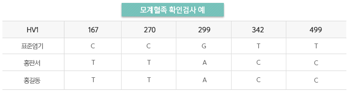 어머니에게만 물려받는 미토콘드리아(MT)유전자를 검사하여 동일한 여자 조상을 가진 모계혈족을 확인하기 위한 검사입니다. 외3촌, 이종4촌등의 모계혈족관계를 확인할수 있습니다. 따라서 돌연변이의 경우를 제외하면 모계혈족인 경우에는 모든 유전자의 염기서열이 일치하게 됩니다.